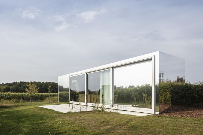 第二部分是想通過它的外表皮的反光材料使體塊消失在景觀中。這片美麗的土地上,我們努力創造出一間盡可能看不見的辦公室,并且總是盡量利用風景。將外層表皮涂上鏡面鋁板,使景觀從各個角度都能反射出來,而且辦公室也會被染上自然色。準確地選擇了與景觀內部連接的開口。有一條小山向附近延伸。二是在這片土地的末端建造了一個小森林。