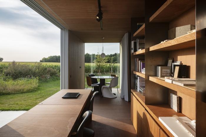 它們放置在負接頭的位置,因此未經處理的鋼帶可以放置在書架之間,形成書架的垂直元件,而不需要額外的部件。這使得用戶可以輕松解構書架和回收材料。復式繪畫的兩個部分就是我們所說的建筑實驗室。他們構成了我們辦公室的知識核心。在這里,來訪者和我們的團隊可以一起工作;從材料、環境中獲得靈感,相互啟發。你可以很容易地在更多的地方看到實驗室的概念。我們可以想象另一個實驗室對另一個網站給出不同的答案,但它仍然是三聯體的一部分。還有更多的設計被稱為polyptych。