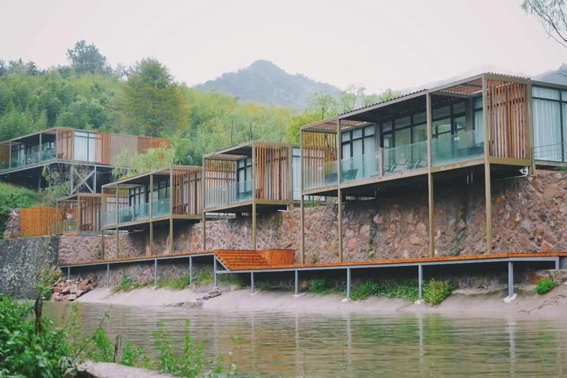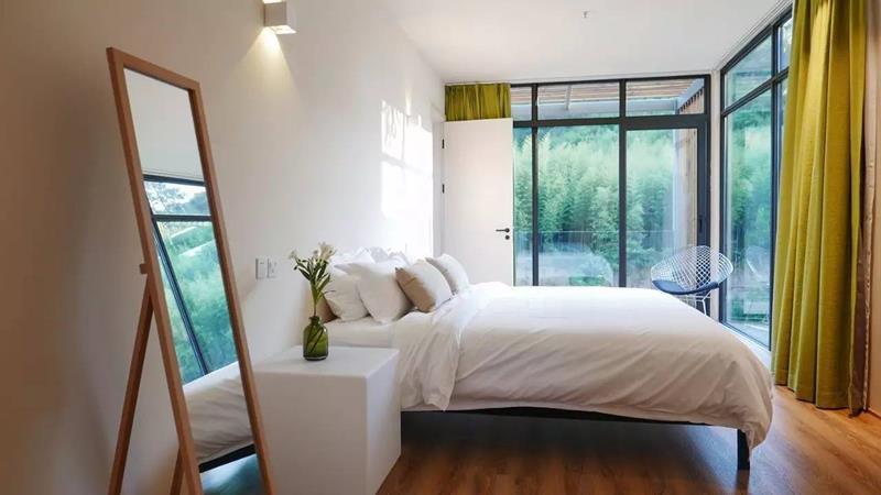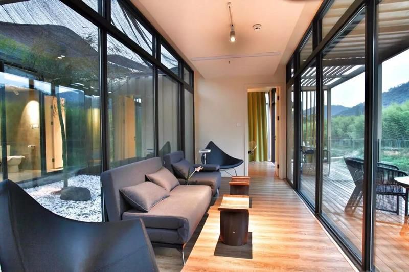 既然叫做“溪地”,必然有一條溪流。溪地整體建筑的線條顯得剛硬,旁邊流過的溪水正好柔化了它。來自奧地利的設(shè)計(jì)師Genceo Berk將山水草木和現(xiàn)代工業(yè)結(jié)合出了別具一格的集裝箱精品酒店,有大面積落地窗的箱體,則種植了莫干山當(dāng)?shù)靥禺a(chǎn)的竹子來做天然屏障保護(hù)隱私。