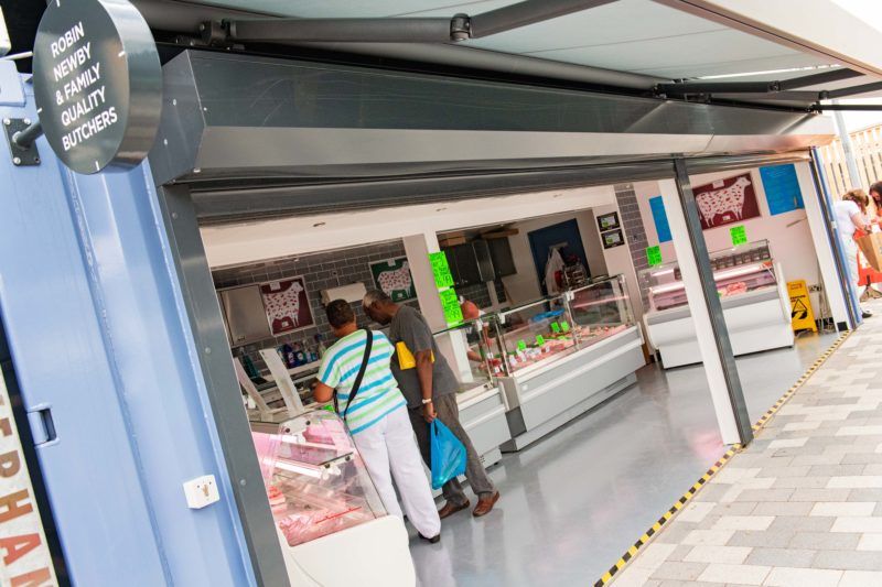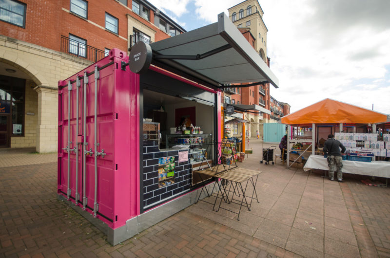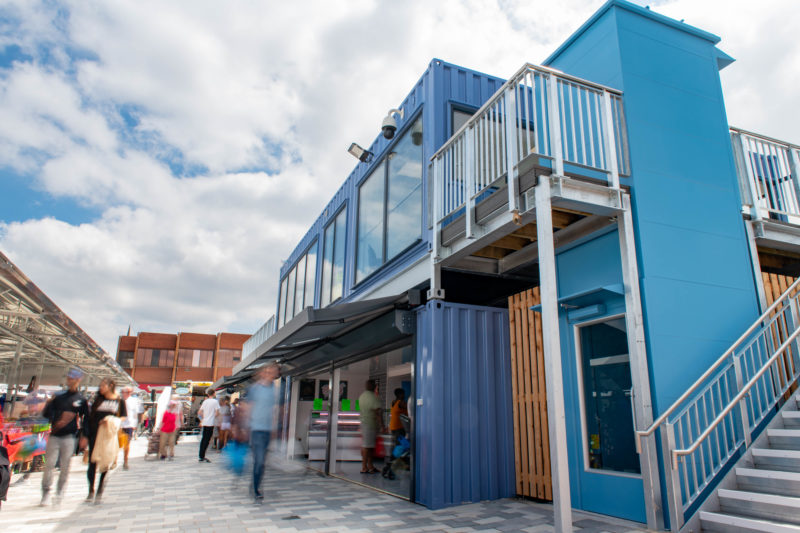 這是位于英國伍爾弗漢普頓市場,經過重新開發和轉移成為城市中心歷史建筑重建的重要部分。為了使市場迅速重新運行,集裝箱是這次重建的主角。同時,集裝箱的模塊結構可以獨立分隔各店鋪,管轄各自店內的衛生環境,保證整個市場的清潔。