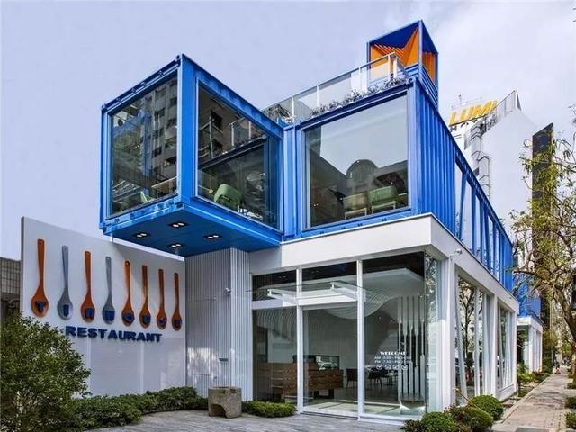 看到如此熟悉的紋路,就應該知道這又是一家集裝箱改造而成的三層建筑了。然而事實是建筑的外表僅以集裝箱鐵皮作為裝飾,實則為鋼骨結構。外觀以藍白為主,形似一艘大船停泊在黎明路上。
