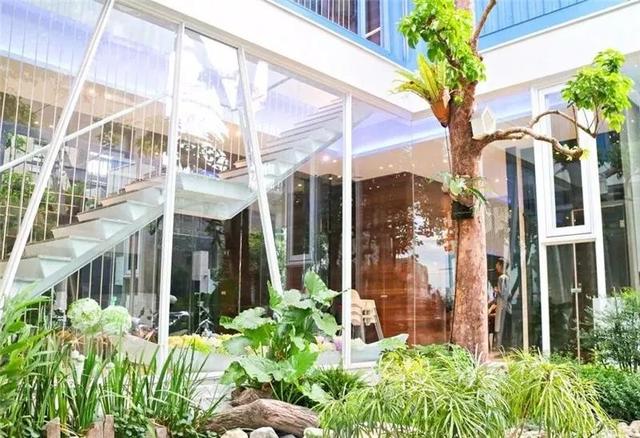 三層樓的設計皆不相同,一樓以密集板加上2D激光,打造出海浪輕涌的造型。門前利用與人行道相接的一小塊空地規劃生態池、種植茄苳。路人經常被外觀所吸引。