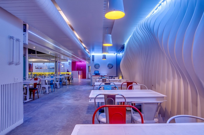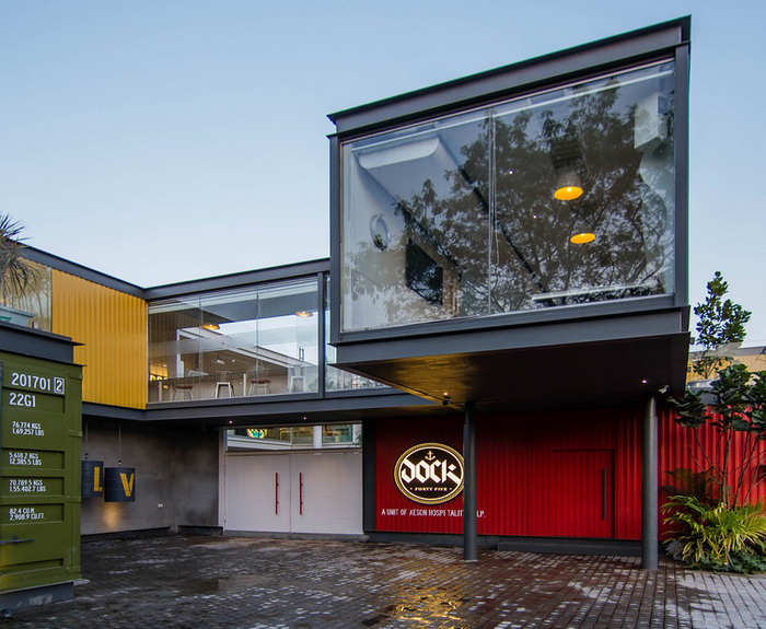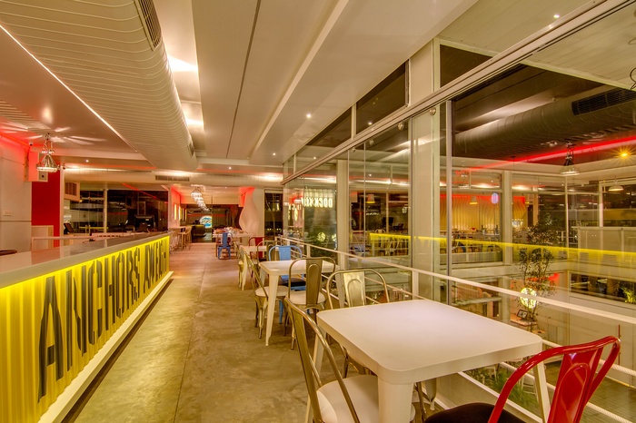 這個由集裝箱組合而成的建筑位于印度,客戶要求設計一個夜總會,并希望有一個航海主題,從食物到空間。進入室內,首先看到的是一個9米長的酒吧,它附著在舞池里。一樓的舞臺能俯瞰大部分的空間,折疊的金屬板樓梯是將人們帶到一樓的兩套樓梯之一。