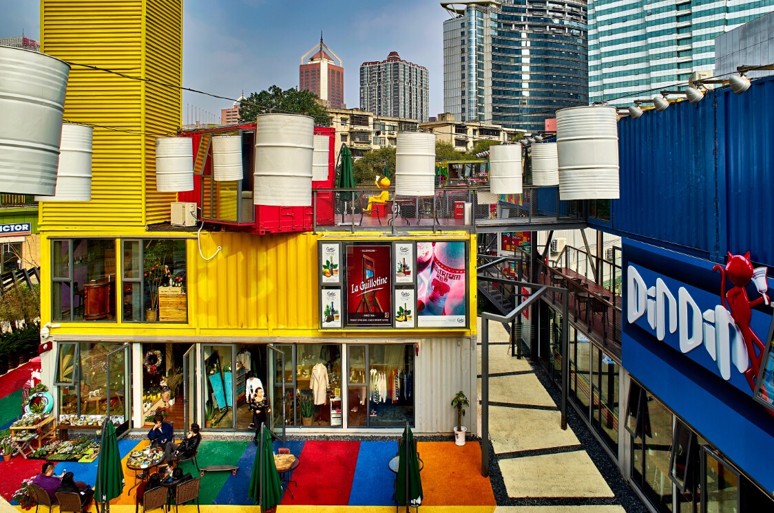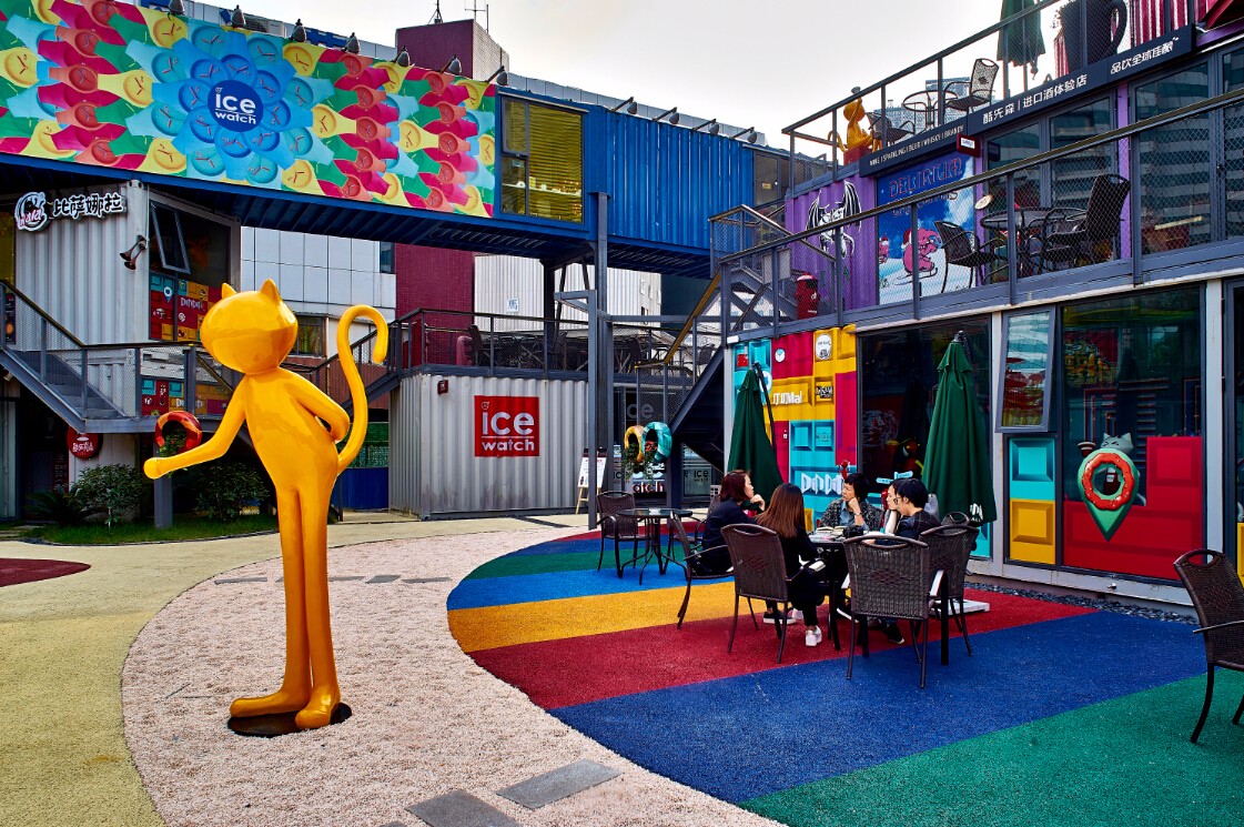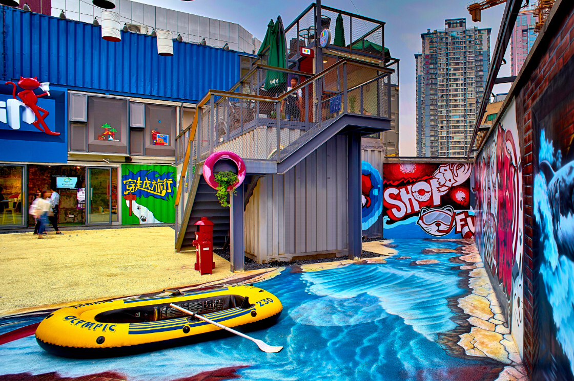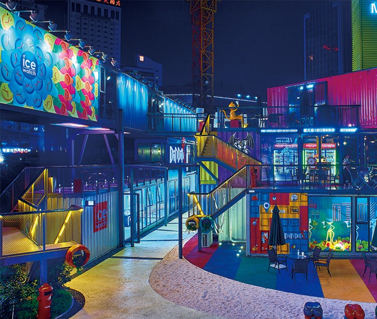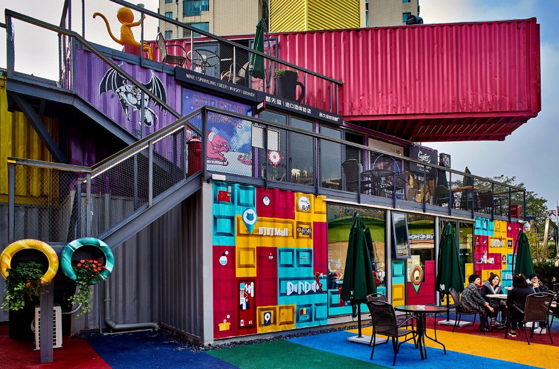 顏色絢麗,個性十足的涂鴉及獨特商業形象吸引了人們的眼球。27個特色的集裝箱交錯堆疊組合展現于眼前,形成了別具一格的商業空間