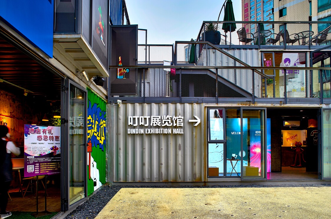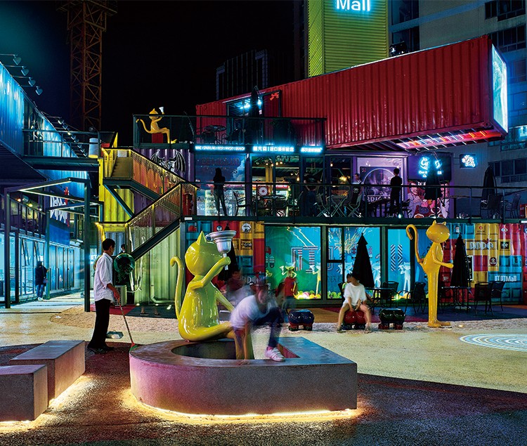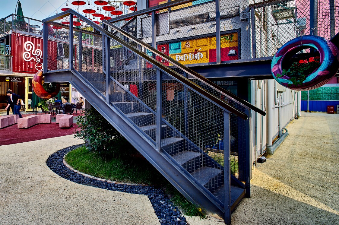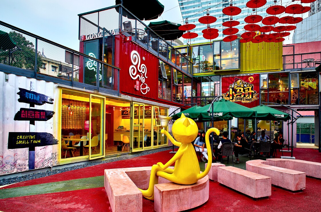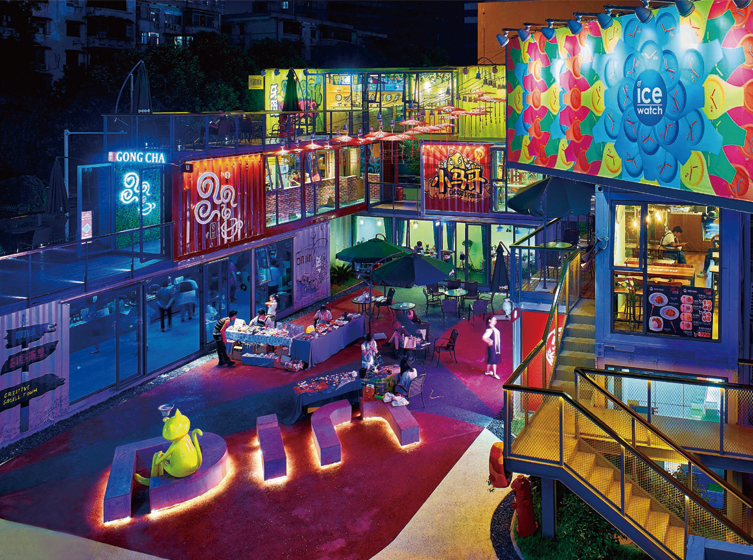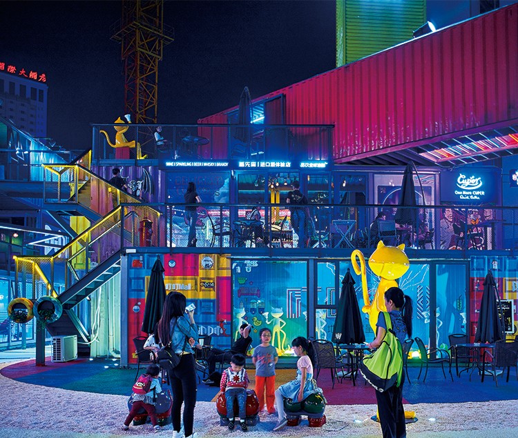顏色絢麗,個性十足的涂鴉及獨特商業形象吸引了人們的眼球。27個特色的集裝箱交錯堆疊組合展現于眼前,形成了別具一格的商業空間